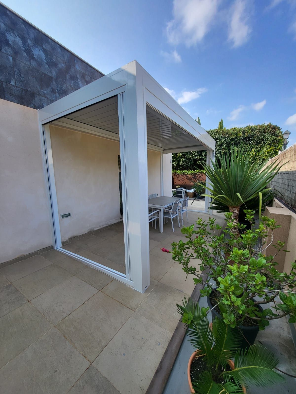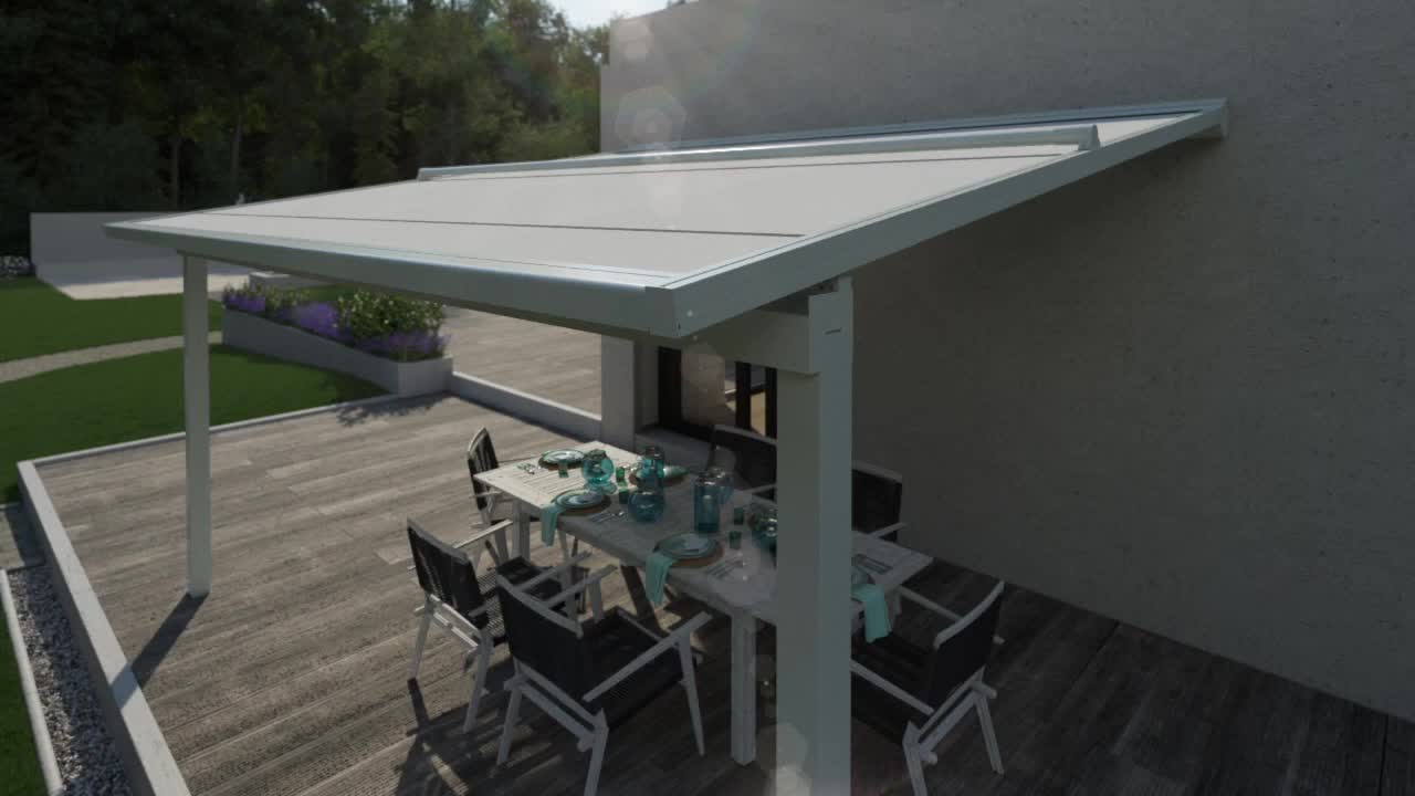 Pérgola bioclimática Elba un sistema de cubierta exterior versátil, capaz de satisfacer todas las necesidades de relajación y protección: Elba le permite gestionar y filtrar el paso de la luz solar más adecuado para cada momento del día, permitiendo también una ventilación natural eficaz y el intercambio de aire. Cuando las lamas están completamente cerradas, Elba protege de la lluvia, favoreciendo el flujo de agua por los bordes exteriores de la estructura. MV LINE